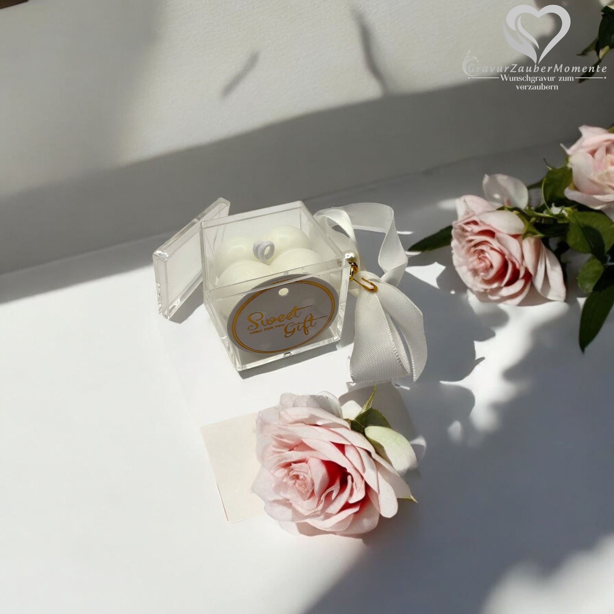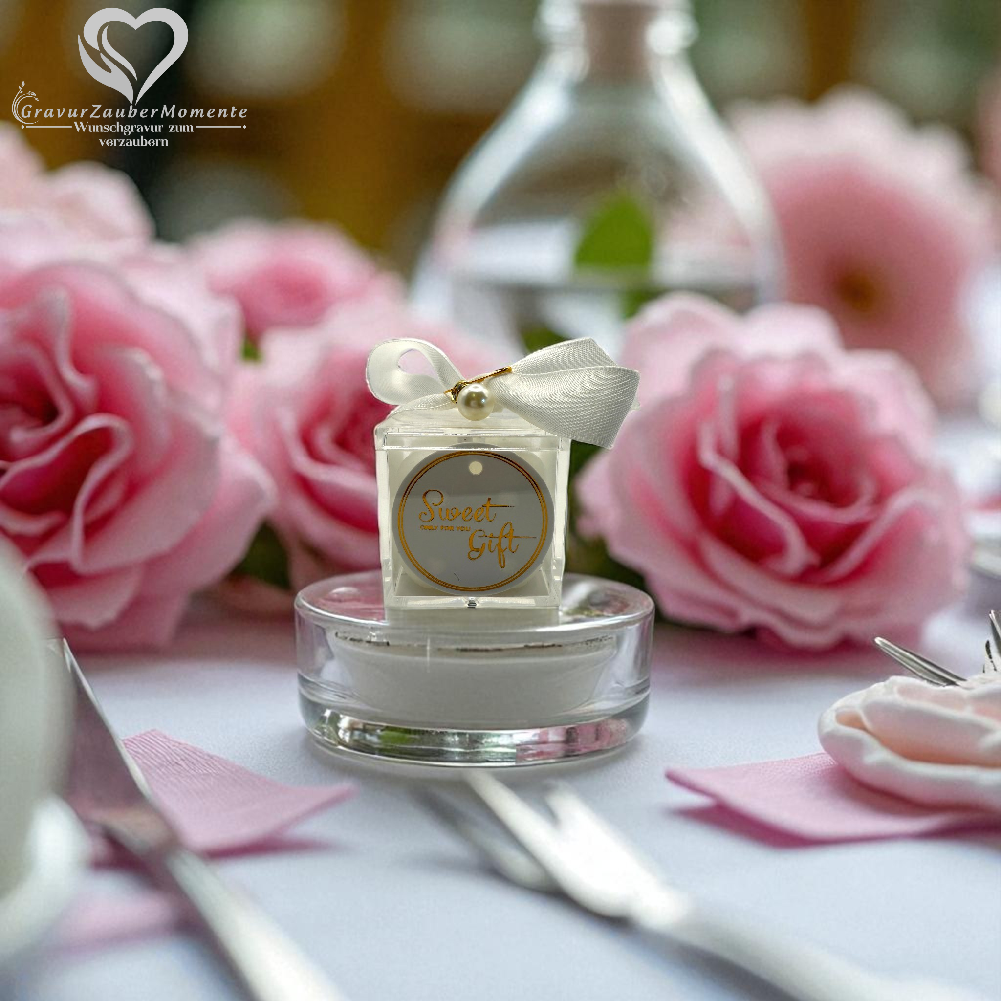 Produktinformationen "Elegante Acrylbox mit Kerze & Schleife graviert – liebevolles Gastgeschenk für besondere Anlässe"