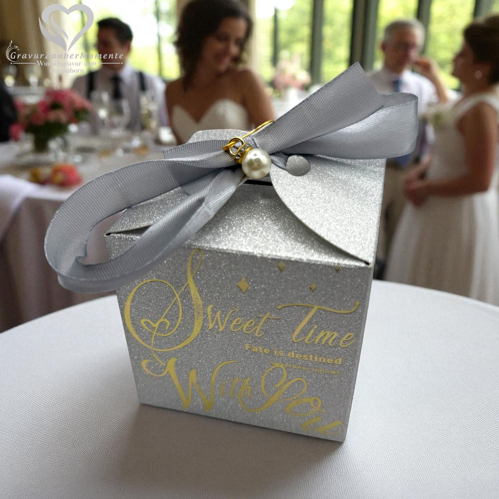 Durch die edle Schleife und die dekorative Oberfläche wirkt die Box luxuriös, ohne überladen zu sein. Sie fügt sich harmonisch in romantische, moderne oder elegante Deko-Konzepte ein und sorgt für einen exklusiven Look auf jedem Fest.