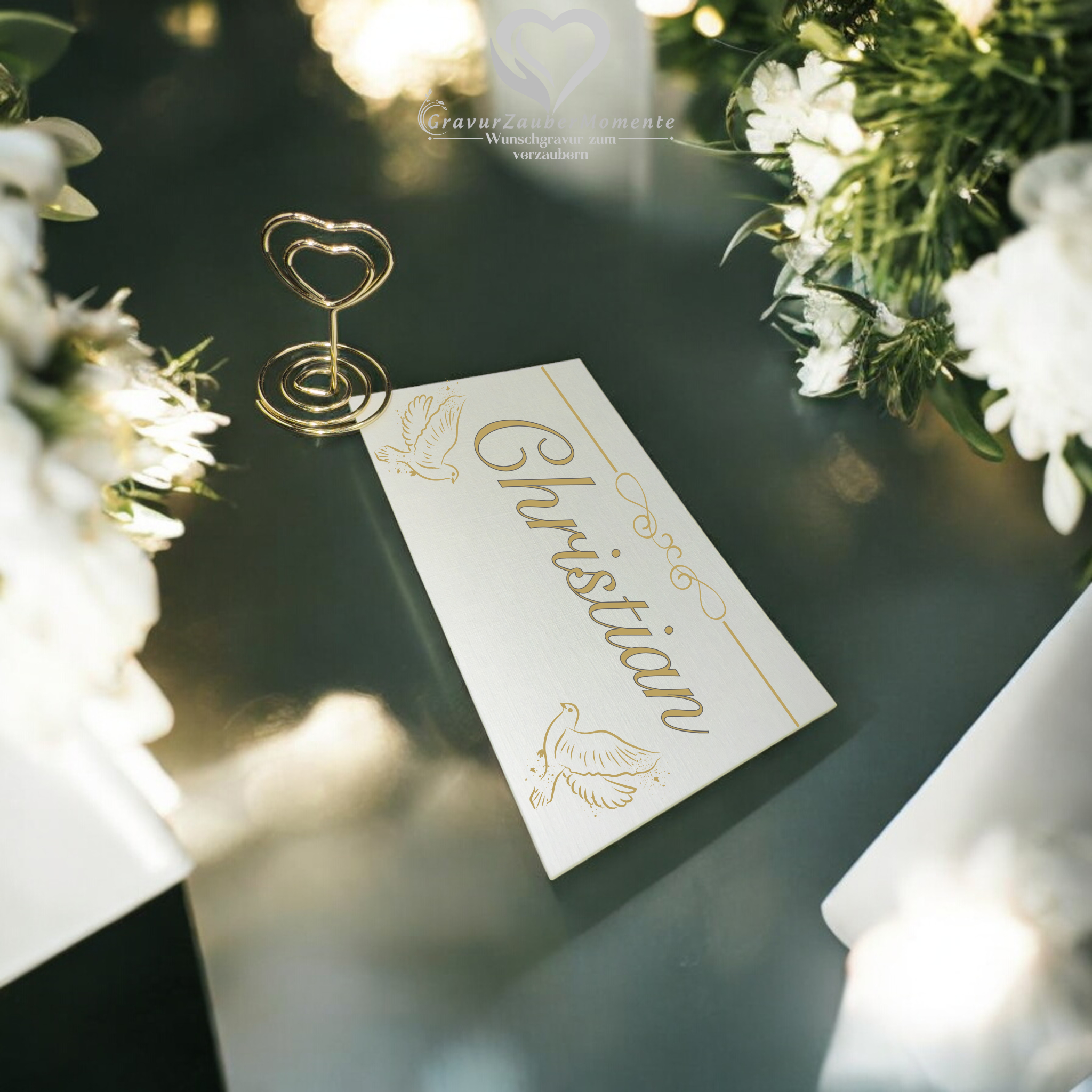 Produktinformationen "Exklusive Platzkarte „Herz aus Gold“ Hoch – Individuell graviert für jeden Gast"