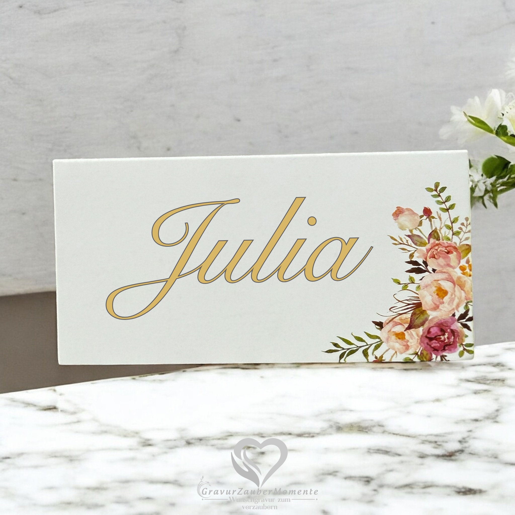 Mach deine Feier unvergesslich mit unseren edlen Tischkarten im modernen Blumendesign. Jede Karte wird individuell mit deinem gewünschten Namen versehen und sorgt so für einen stilvollen Hingucker auf jeder festlich gedeckten Tafel.