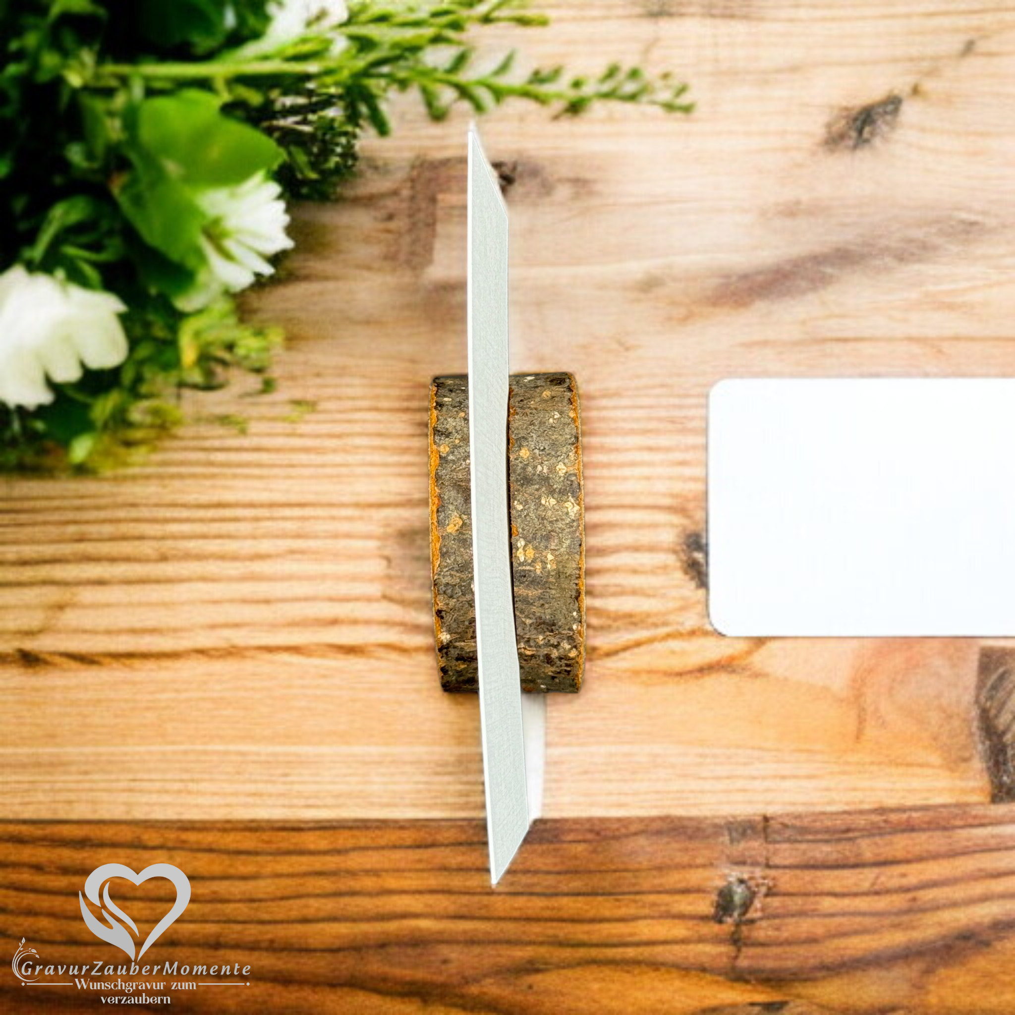 Der natürliche Holzhalter mit feiner Gravur kombiniert rustikalen Charme mit modernem Design – perfekt für Boho-, Vintage-, Natur- und klassische Hochzeiten.