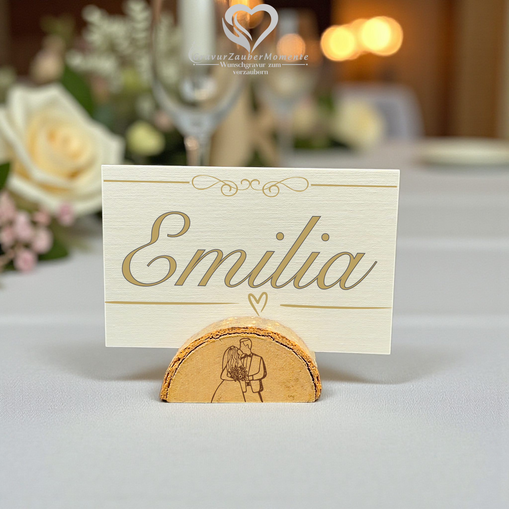 Diese hochwertig gravierte Tischkarte mit graviertem Namenshalter verleiht jeder Hochzeit, Feier oder besonderen Veranstaltung eine edle und persönliche Note.